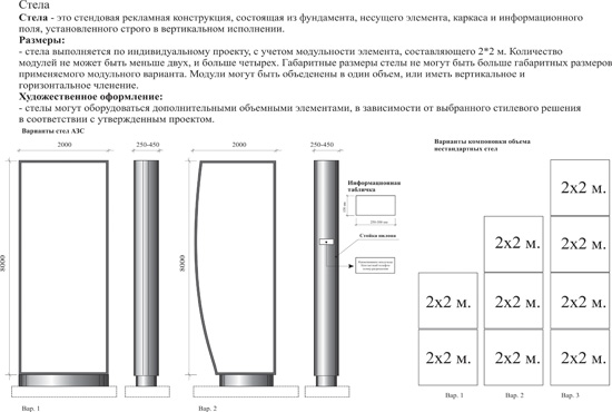 Под проектированием стел для АЗС принято понимать процесс определения архитектуры, компонентов, интерфейсов и других характеристик рекламно-информационной конструкции. Результатом проектирования стелы является технический проект – целостная совокупность моделей, свойств или характеристик, описанных в форме, пригодной для реализации указанной конструкции.