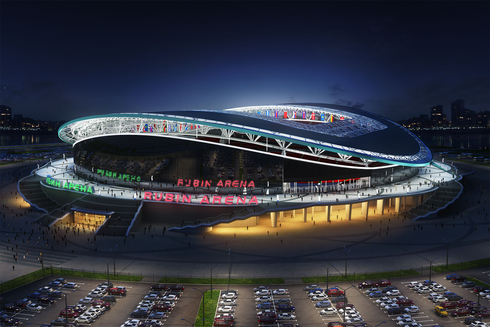 6) Стадион «Казань Арена» (Россия). Медиафасад является самым большим в Европе. Площадь конструкции – 37000 кв. метров. Расположен медиафасад на стадионе «Казань Арена». Экран был построен в 2013 году.