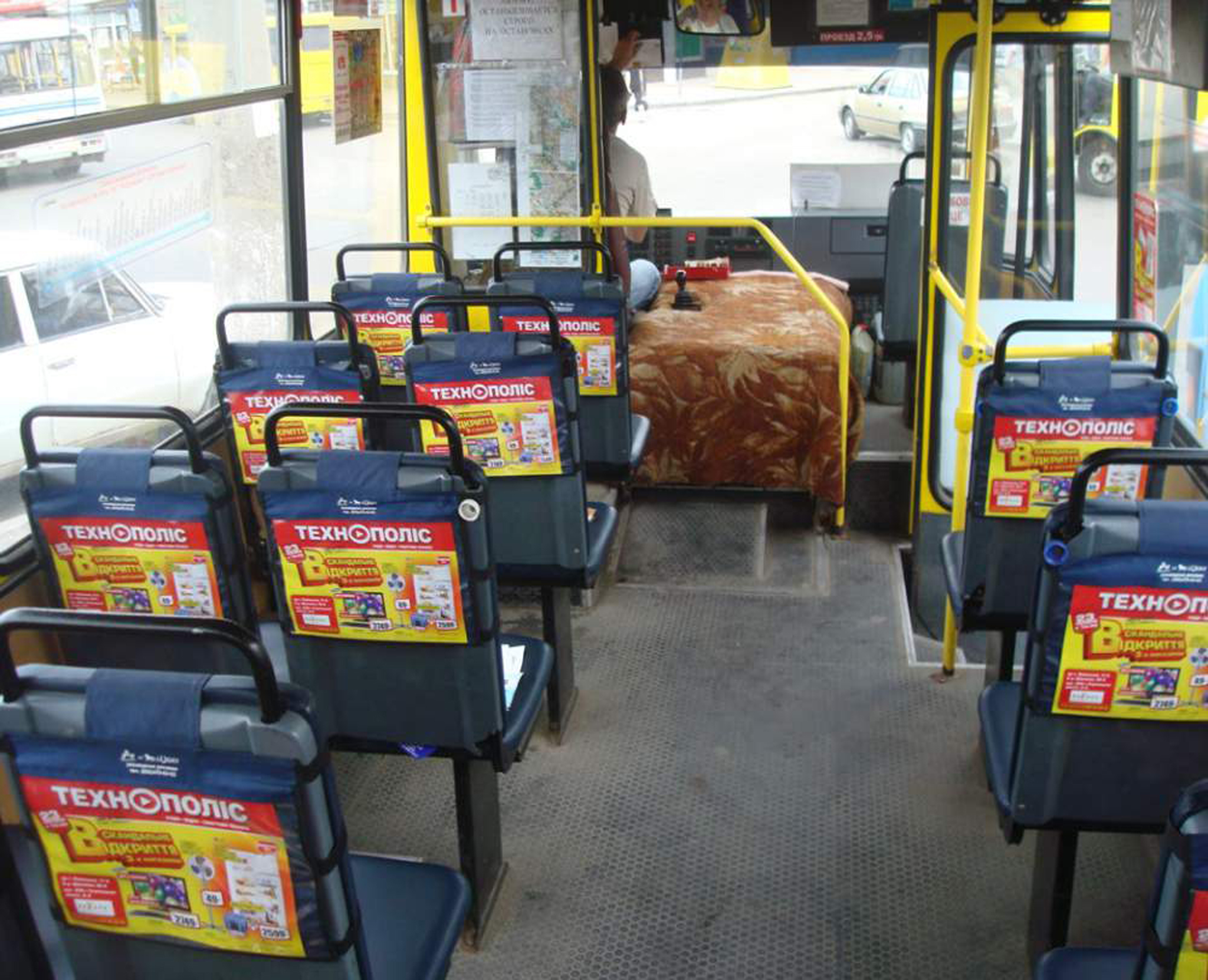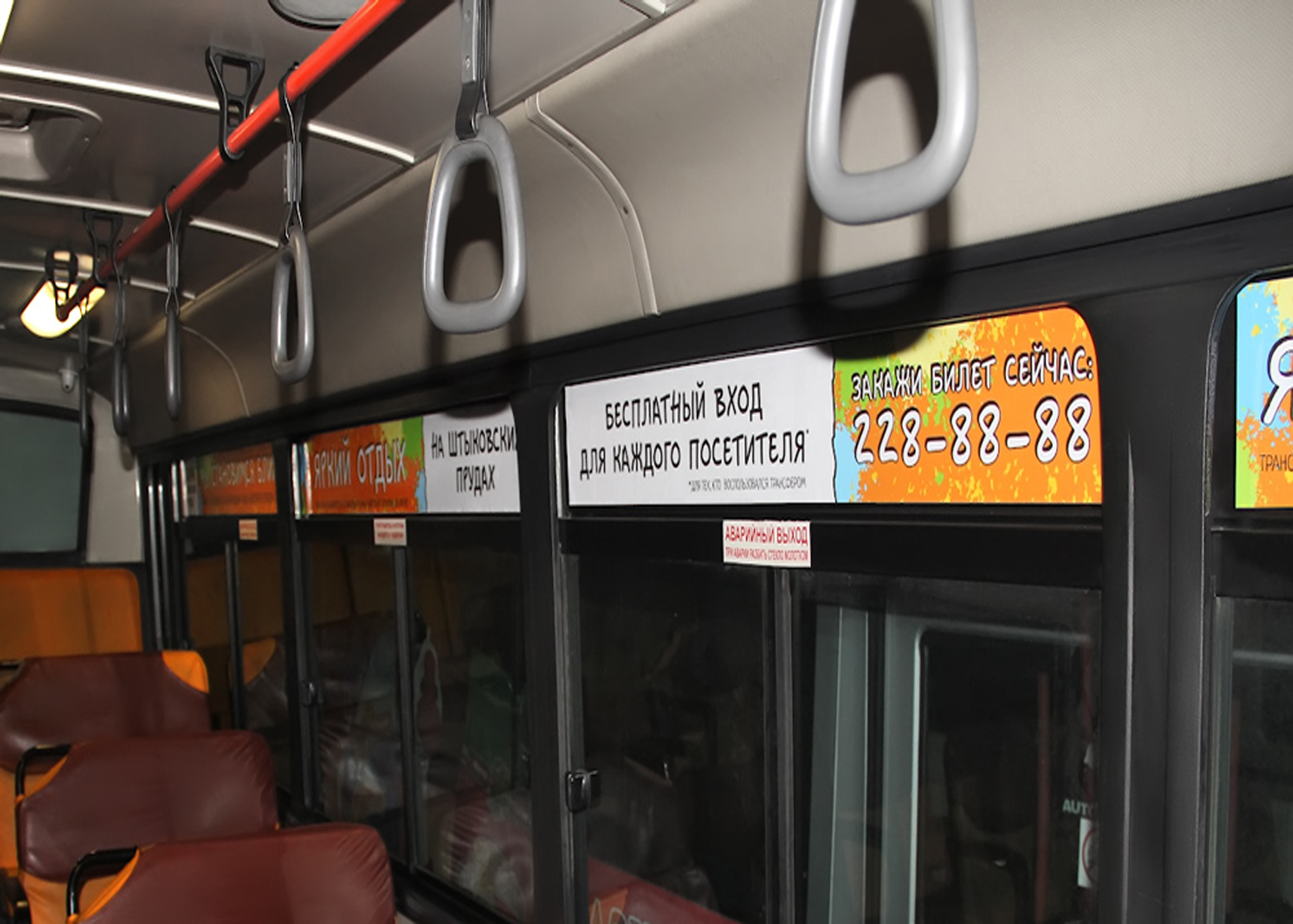 Рекламные стикеры в междугороднем автобусе на фото выше