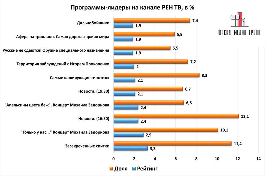 Популярность телеэфира на «РЕН ТВ» приводит к ежегодному увеличению спроса на рекламное время. Для привлечения клиентов из разных регионов России, увеличения процента продаж, повышения имиджа компании и узнаваемости бренда – размещайте рекламу на «РЕН ТВ». «РЕН ТВ» – это проверенный и востребованный канал для размещения рекламы на лабинском ТВ. Для размещения рекламы на телевидении обращайтесь в рекламное агентство «Фасад Медиа Групп». Будем рады сотрудничеству.