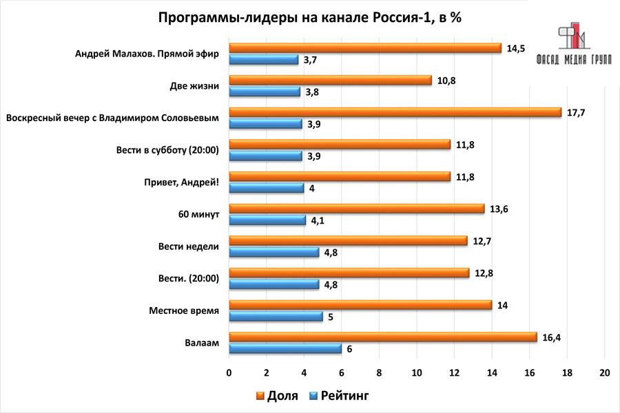 Популярность телеэфира на «Втором канале» приводит к ежегодному увеличению спроса на рекламное время. Для привлечения клиентов из разных регионов России, увеличения процента продаж, повышения имиджа компании и узнаваемости бренда – размещайте рекламу на «России 1». «Второй» – это проверенный и востребованный канал для размещения рекламы на лабинском ТВ. Для размещения рекламы на телевидении обращайтесь в рекламное агентство «Фасад Медиа Групп». Будем рады сотрудничеству.