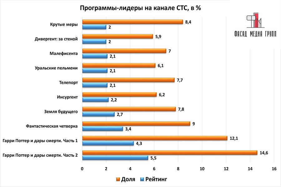 Популярность телеэфира на «СТС» приводит к ежегодному увеличению спроса на рекламное время. Для привлечения клиентов из разных регионов России, увеличения процента продаж, повышения имиджа компании и узнаваемости бренда – размещайте рекламу на «СТС». «СТС» – это проверенный и востребованный канал для размещения рекламы на лабинском ТВ. Для размещения рекламы на телевидении обращайтесь в рекламное агентство «Фасад Медиа Групп». Будем рады сотрудничеству.
