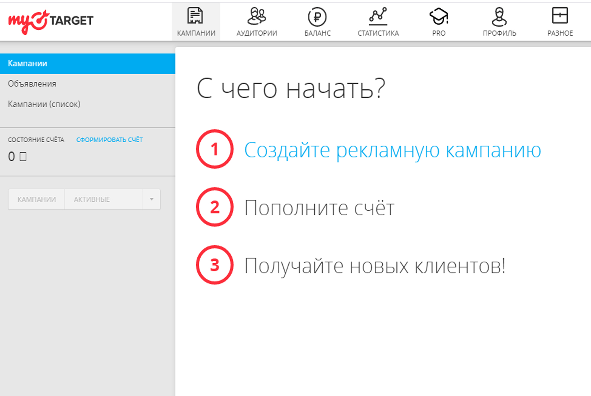 Зачастую наши клиенты спрашивают, как запустить рекламу в Mail.ru (Мэйл)? Необходимо отметить, что реклама в Mail.ru (Мэйл) запускается через платформу myTarget. Приводим алгоритм действий для настройки и запуска рекламы в myTarget: