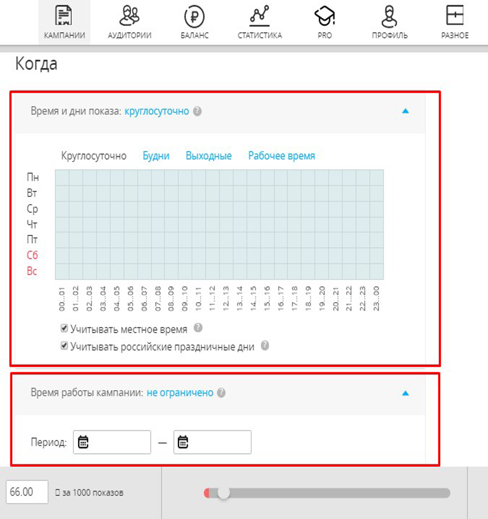 2) Частота показов. В данном разделе вы можете задать лимит показов уникальному пользователю либо на всю кампанию, либо на каждое объявление.