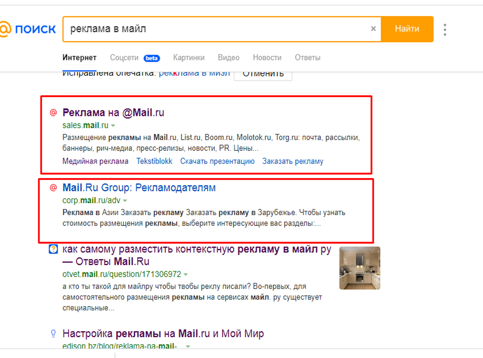 2. В зависимости от содержания рекламного объявления в Mail.ru (Мэйл):
