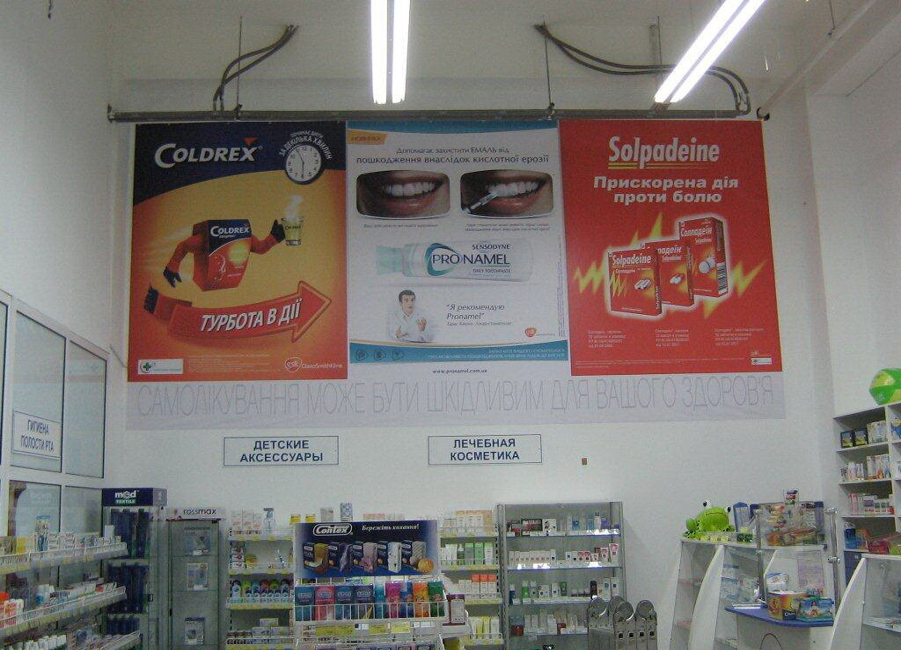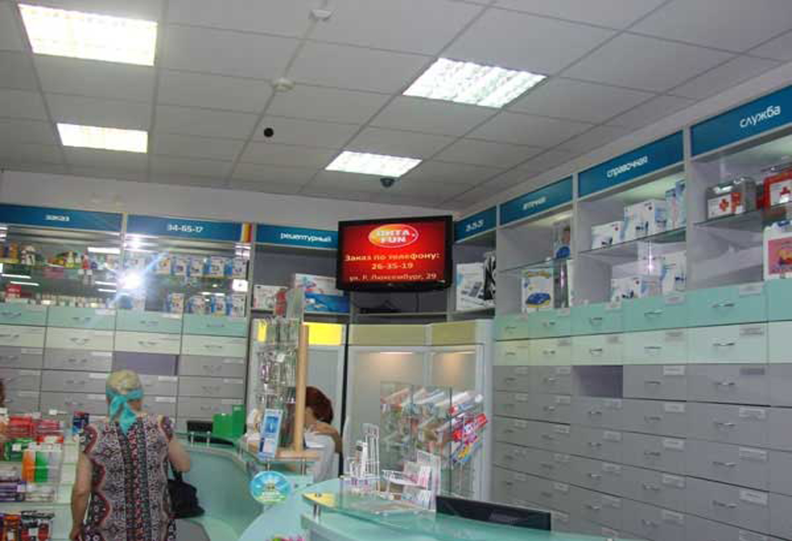 Пример рекламы под сводом в аптеке: