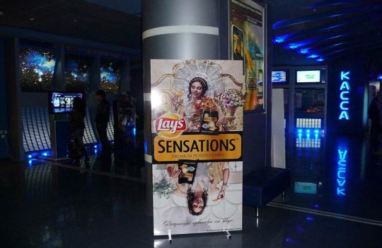 Пример рекламы в виде напольных конструкций в кинотеатре: