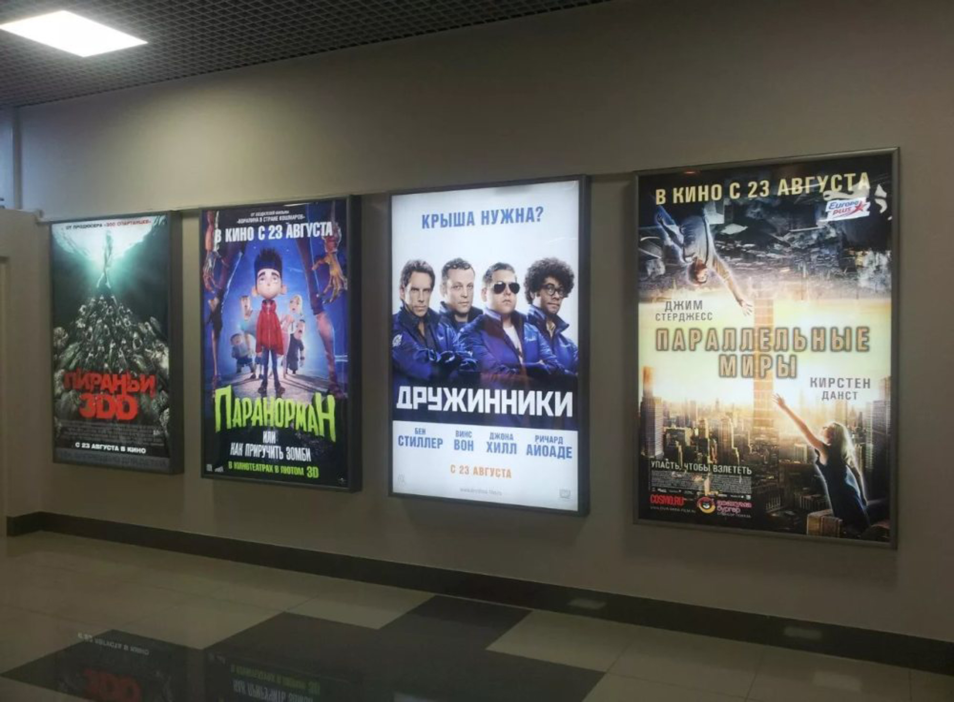 Реклама в кинотеатрах отличается тем, что рекламные материалы располагаются на уровне глаз потенциального клиента или покупателя. Удачное расположение рекламы приводит к тому, что листовки, буклеты и другие форматы рекламы в кинотеатрах хорошо видны и обеспечивают 100% читаемость со стороны посетителей.